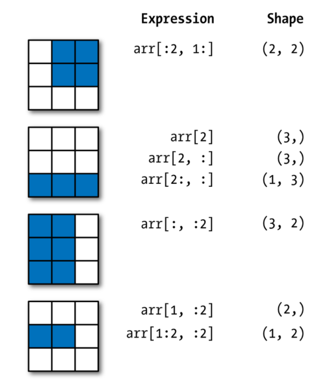 array1d = np.arange(start =1, stop = 10) array2d = array1d.reshape(3,3) print('array2d:\n', array2d) print('array2d[0:2, 0:2] \n', array2d[0:2, 0:2]) print('array2d[1:3, 0:3] \n', array2d[1:3, 0:3]) print('array2d[1:3, :] \n', array2d[1:3, :]) print('array2d[:, :] \n', array2d[: , :]) print('array2d[:2, 1:] \n', array2d[:2, 1:]) print('array2d[:2, 0] \n', array2d[:2, 0])